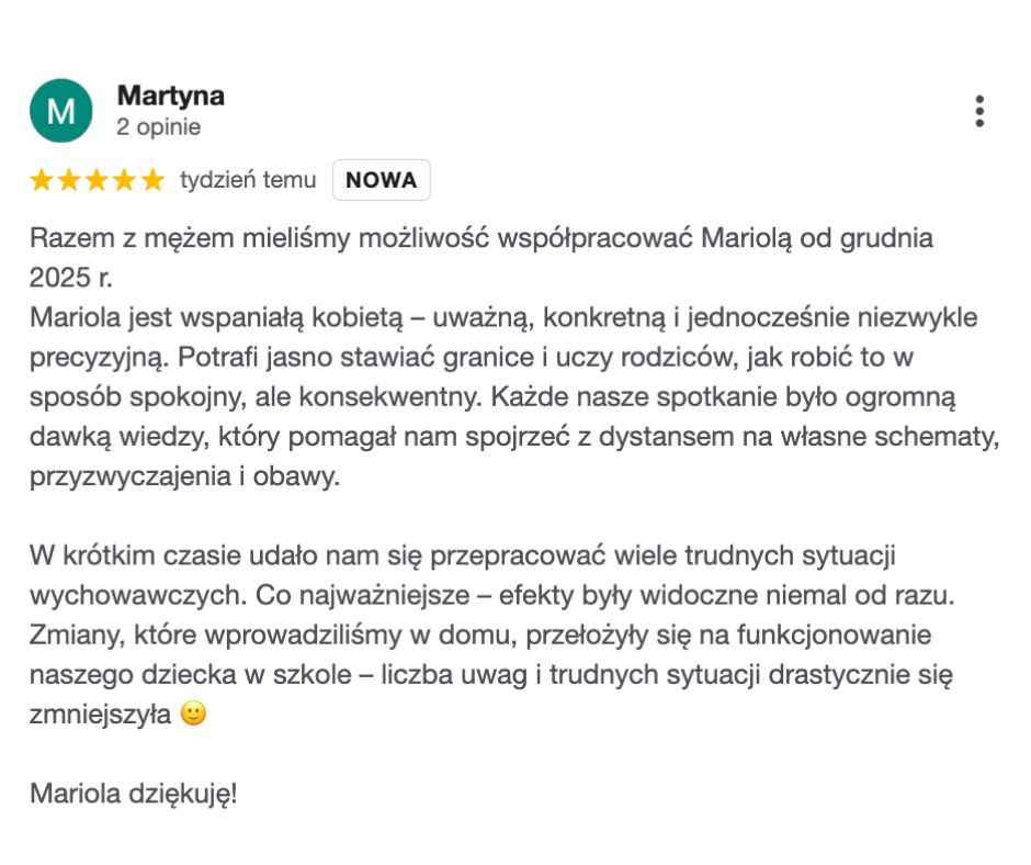 Razem z mężem mieliśmy możliwość współpracować Mariolą od grudnia 2025 r. Mariola jest wspaniałą kobietą – uważną, konkretną i jednocześnie niezwykle precyzyjną. Potrafi jasno stawiać granice i uczy rodziców, jak robić to w sposób spokojny, ale konsekwentny. Każde nasze spotkanie było ogromną dawką wiedzy, który pomagał nam spojrzeć z dystansem na własne schematy, przyzwyczajenia i obawy (...)