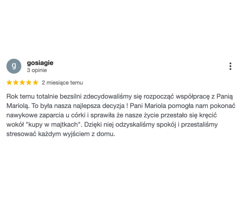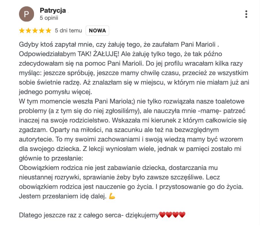 Polecam!! Pani Mariola przeprowadziła nas profesjonalnie przez najtrudniejszy temat, z jakim kiedykolwiek zmierzyliśmy się. Mieliśmy wsparcie na każdym etapie- a jak się okazało temat kupy, nie dotyczy tylko kupy 😱 podczas każdego spotkania otrzymywaliśmy tak wiele praktycznych wskazówek, których w internecie nie znajdziemy (...)