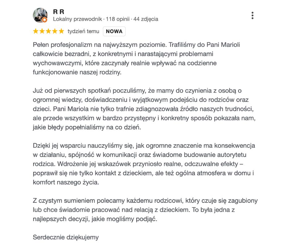 Pełen profesjonalizm na najwyższym poziomie. Trafiliśmy do Pani Marioli całkowicie bezradni, z konkretnymi i narastającymi problemami wychowawczymi, które zaczynały realnie wpływać na codzienne funkcjonowanie naszej rodziny.Już od pierwszych spotkań poczuliśmy, że mamy do czynienia z osobą o ogromnej wiedzy, doświadczeniu i wyjątkowym podejściu do rodziców oraz dzieci. Pani Mariola nie tylko trafnie zdiagnozowała źródło naszych trudności, (...)